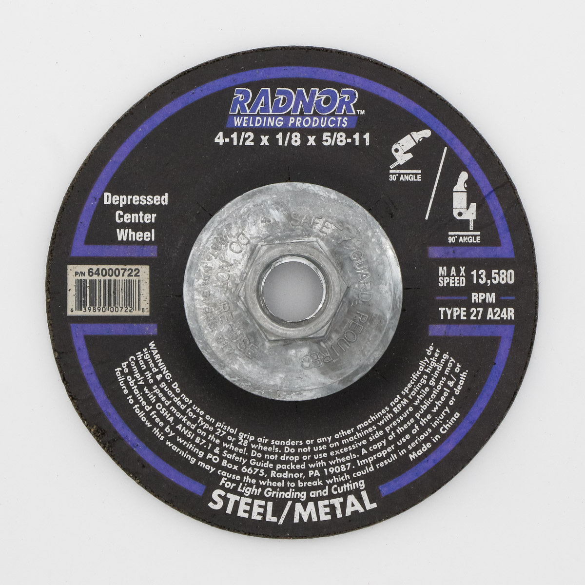 - RADNOR™ A24R Type 27 Depressed Center Combination Wheel measuring 4 1/2" X 1/8" X 5/8"-11 is an ideal right angle grinder that provides consistent quality by featuring aluminum oxide grain contraction. 4 1/2 " Dia wheel that offers maximum RPM of 13580 is an ideally suited for on-site and small unit jobs like cutting-off, notching and light side grinding. Durable wheel is used on grinding on alloys, steels, ferrous metals while providing ultimate results on stainless steel. Wheel features free cutting to provide consistent quality.