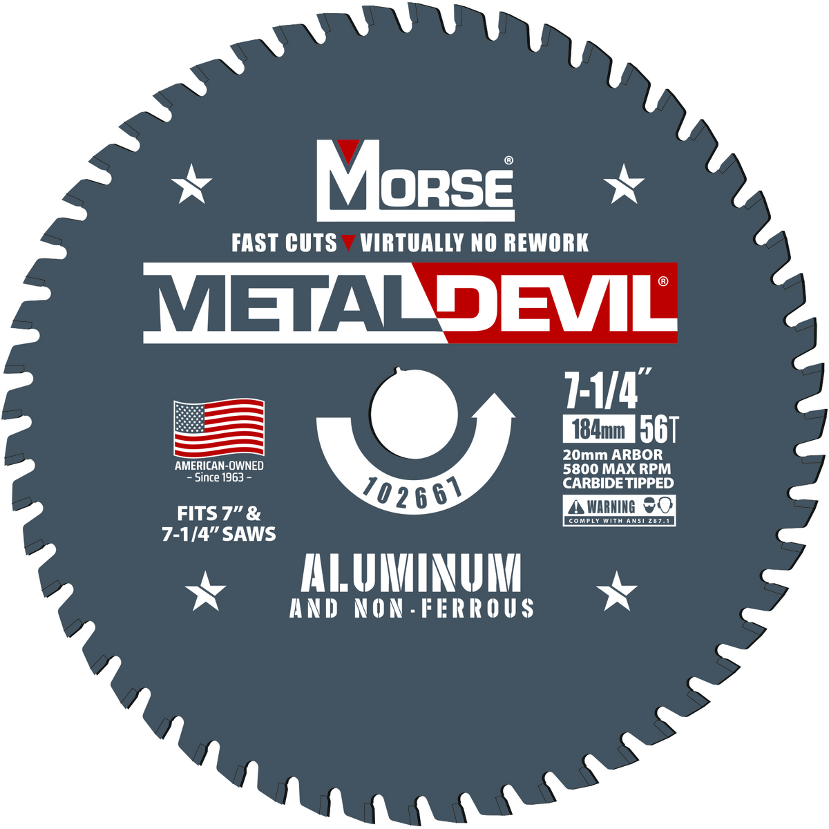 - Morse® Metal Devil, CSM7255620FNFC (102667), 7-1/4" (184mm) carbide tipped circular saw blade is specifically designed for cutting non-ferrous (aluminum, brass, copper) tubing, extrusion or other structural shapes not exceeding 3/8" wall thickness. Blade comes standard as 20mm arbor.