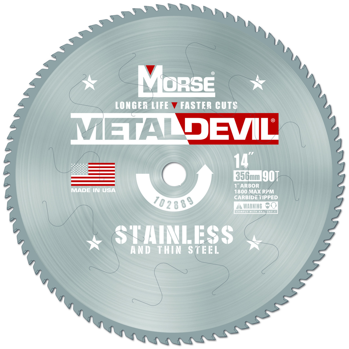 - Morse® Metal Devil, CSM1490FSSC (102889), 14" (356mm) carbide tipped circular saw blade is specifically designed for cutting stainless steel plate or small solids not exceeding in 1/4" thickness, thinner steel and stainless tubing, channel or other structural shapes not exceeding 1/8" wall thickness. Blade has standard 1" diameter arbor hole.