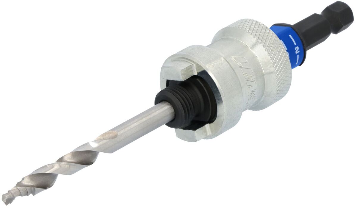 - Snap-back 2-step release - step 1) unlock hole saw, step 2) unlock pilot bit