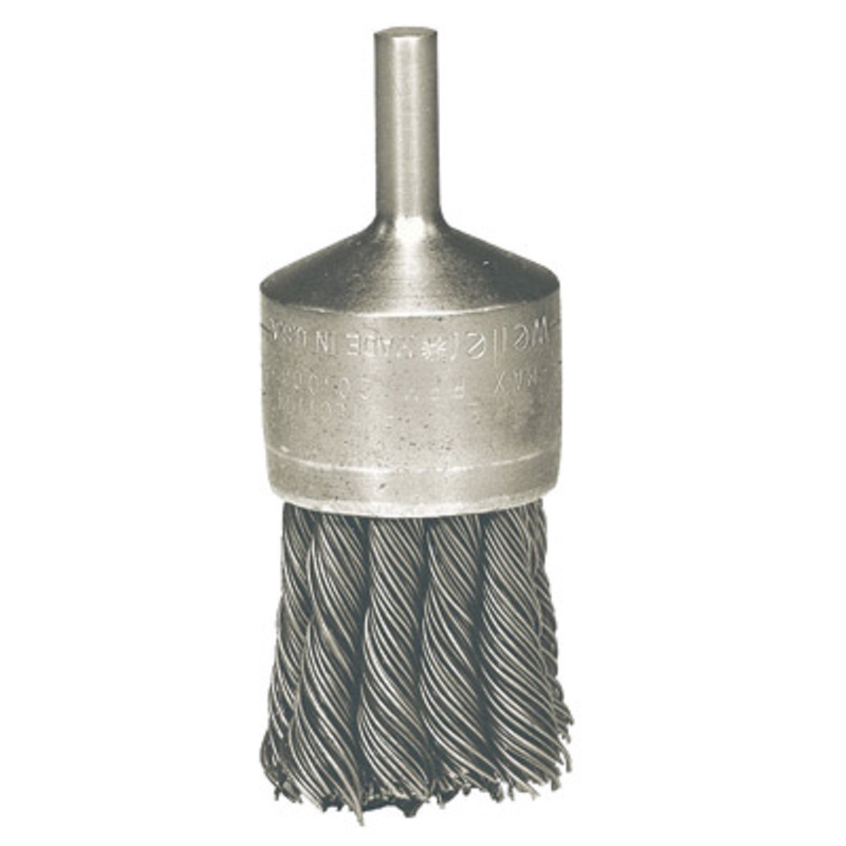 - Weiler® 1 1/8" X 0.014" Knot Wire End Brush with 1/4" arbor hole has rugged construction that provides aggressive, high-impact action for several applications and rotates at a speed of 22000 RPM. Stainless steel wire brush with 7/8" trim length removes large burrs and heavy contamination. Application areas include cleaning ID's, internal passages, recessed areas, deburring internal edges and cross hole intersections. It is mounted on stem for safe operation at high speed and quick mounting into the collect or chuck of either electric or pneumatic die grinders.