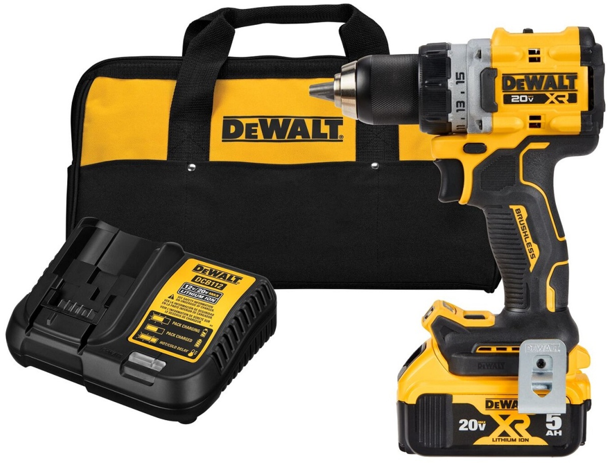 - Engineered for professional-grade performance, the 20V MAX XR Brushless 1/2 in. Drill/Driver delivers the power and speed needed for heavy-duty drilling and fastening applications. The high-output brushless motor helps you tackle demanding projects with up to 40% more Unit Watts Out compared to the DEWALT DCD791B using DCB205 battery (sold separately). Complete a wide range of drilling jobs with this versatile power tool, which outputs up to 2,000 rpm when drilling into wood and metal. This lightweight, well-balanced Drill/Driver was built compact to help users comfortably work in tight spaces for extended periods of time. The 3-position, pivoting LED is designed to enhance visibility in dimly lit work areas with its 3 mode settings and up to 70 Lumens of brightness. This kit includes one DCB205 20V MAX 5Ah battery, charger, belt hook and kit bag.
