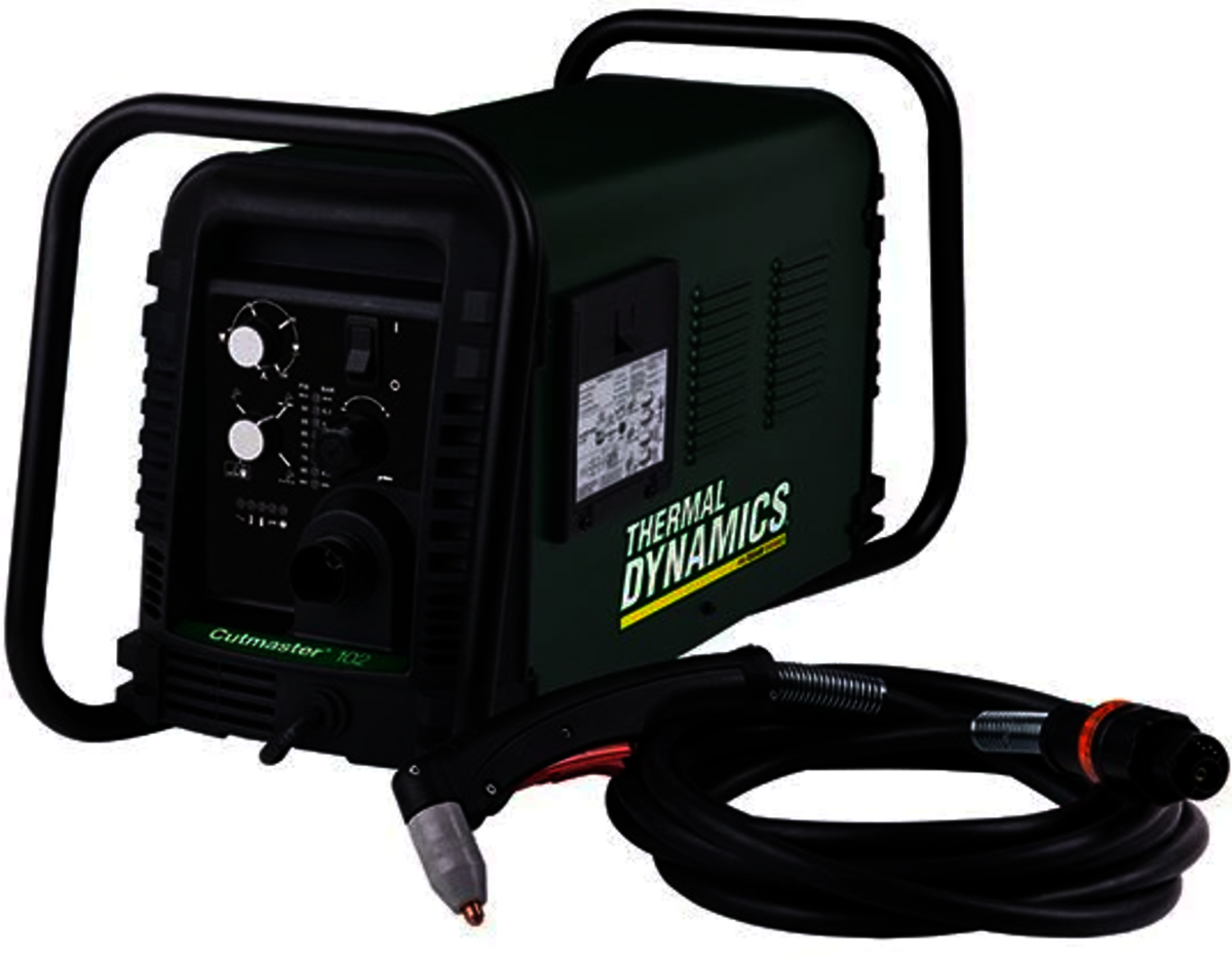 - Thermal Dynamics™ Cutmaster™ Yes™ Series 102 Air Plasma Cutter with a maximum cutting thickness of 1 3/4" has an input of 460 V and has an output of 100 A. Cutter has a pierce rating of 3/4" and is used for heavy fabrication, manufacturing and contractors. It has an amperage range of 20 - 100 A and includes a power supply, 50' lead, SL100 torch with a 75 deg head, 10' input power cable without plug, work cable and clamp, spare parts kit and an operating manual. Cutter measuring 15" X 12" X 30" has an air pressure of 70 psi with a 7. 5 cfm flow and offers a duty cycle of 60% at 100 A, 80% at 80 A and 100% at 70 A. The Yes guard bar secures the power supply for durability and facilitates easy transportation. The front panel of the cutter features all the controls and the color coded LEDs denote pressure status and setup errors. Lightweight cutter features a 60 A drag tip and the trigger latch reduces the hand fatigue during long cuts. Cutter offers multiple voltage design that facilitates operation from 208 - 480 V and the storage compartment is used to store spare parts and consumables. The 1 Torch having ATC disconnect permits you to add lead extensions or it can be converted into a machine torch. The autopilot restart quickly initiates the pilot arc and cuts expanded metals and the cutter offers hand torch switch or hand pendant control.