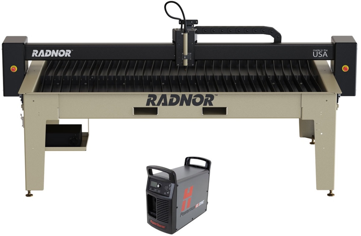 - The RADNOR™ 5' x 10' Cutting Table has been designed for fabricators and metal workers who demand cost-effective and robust industrial tables. This CNC cutting table can integrate with plasma machines to create a complete cutting system that works in synchronicity for smooth and efficient cutting of all of your parts and designs. The product package includes the Hypertherm® Powermax65 SYNC® Plasma Cutter (HYP083349) and FlashCut® CNC Software (Version 10.0 Pro Software). Version 10.0 Minimum System Specifications: OS: 64-bit Windows, Win10 or newer, CPU: 2-core Intel i3 or equivalent, clock speed at or greater than 2.1 GHz, Memory: 8GB RAM, Storage: Solid-state drive, Communications: 1x USB, +1x USB, (Servo only), +1x USB (Plasma communications only), +1x USB (Control pendant only)