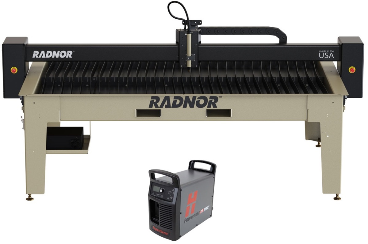 - The RADNOR™ 5' x 10' Cutting Table has been designed for fabricators and metal workers who demand cost-effective and robust industrial tables. This CNC cutting table can integrate with plasma machines to create a complete cutting system that works in synchronicity for smooth and efficient cutting of all of your parts and designs. The product package includes the Hypertherm® Powermax85 SYNC® 200-600 V Cutting Machine and FlashCut® CNC Software (Version 10.0 Pro Software). Version 10.0 Minimum System Specifications: OS: 64-bit Windows, Win10 or newer, CPU: 2-core Intel i3 or equivalent, clock speed at or greater than 2.1 GHz, Memory: 8GB RAM, Storage: Solid-state drive, Communications: 1x USB, +1x USB, (Servo only), +1x USB (Plasma communications only), +1x USB (Control pendant only)