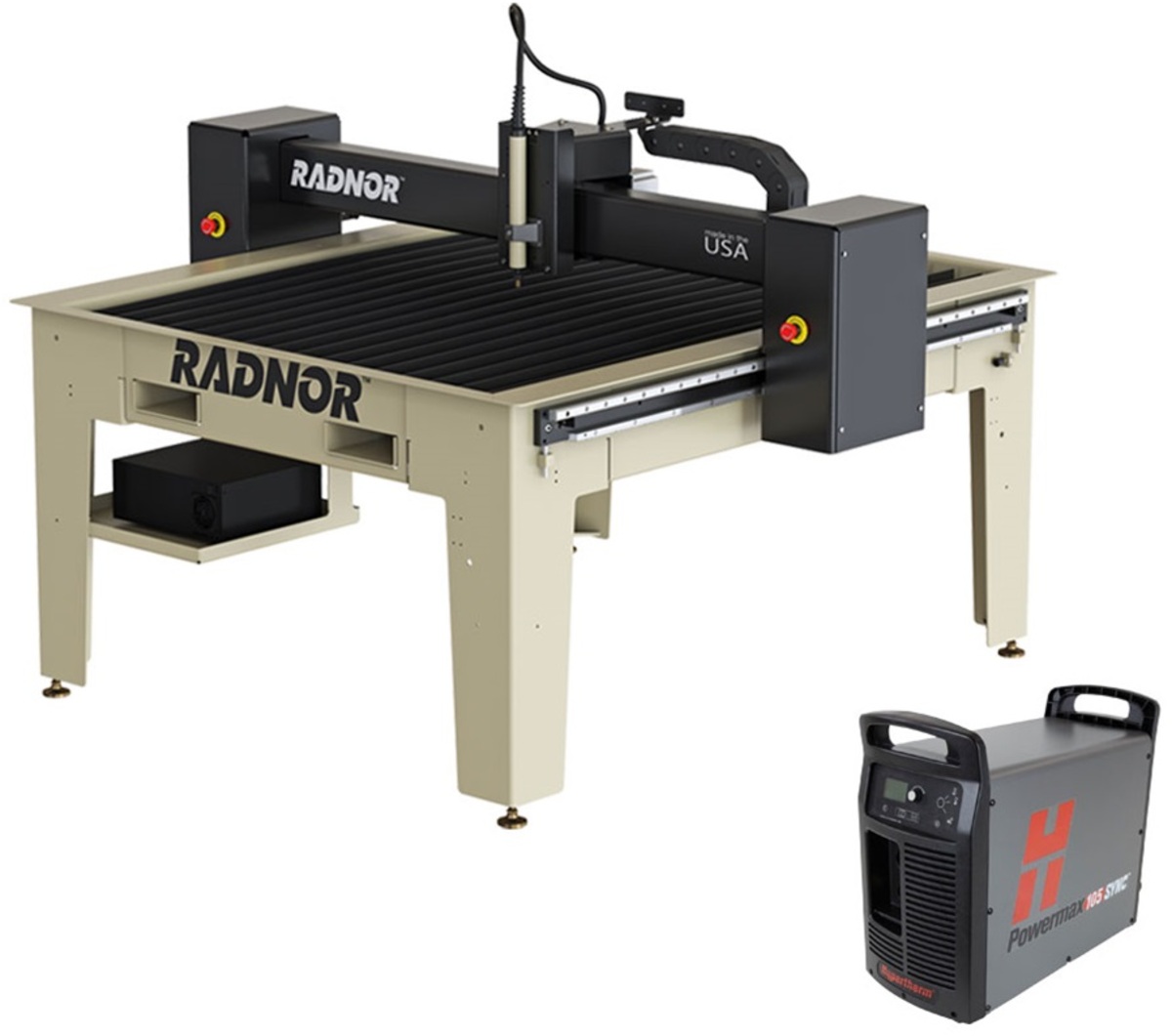 - The RADNOR™ 4' x 4' Cutting Table has been designed for fabricators and metal workers who demand cost-effective and robust industrial tables. This CNC cutting table can integrate with plasma machines to create a complete cutting system that works in synchronicity for smooth and efficient cutting of all of your parts and designs. The product package includes the Hypertherm® Powermax105 SYNC™ 200-600 V Cutting Machine and FlashCut® CNC Software (Version 10.0 Pro Software). Version 10.0 Minimum System Specifications: OS: 64-bit Windows, Win10 or newer, CPU: 2-core Intel i3 or equivalent, clock speed at or greater than 2.1 GHz, Memory: 8GB RAM, Storage: Solid-state drive, Communications: 1x USB, +1x USB, (Servo only), +1x USB (Plasma communications only), +1x USB (Control pendant only)